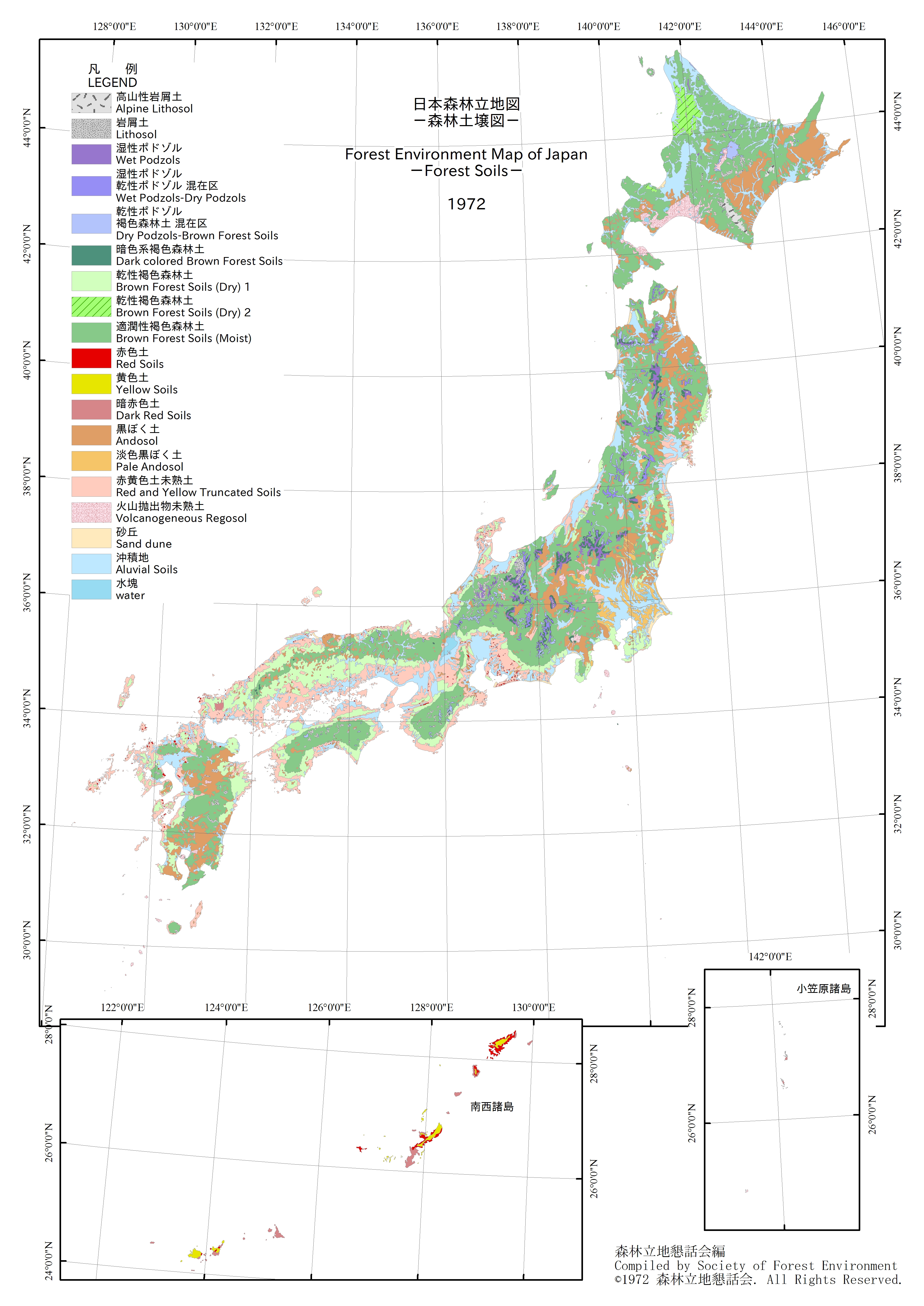 本会の前身の森林立地懇話会で1972年に作成した日本森林立地図のうち、